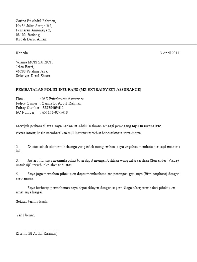 Katanya dari biro angkasa. Cara untuk membatalkan polisi takaful atau insurans anda. Jalan SS 61 Peti Surat 8797.